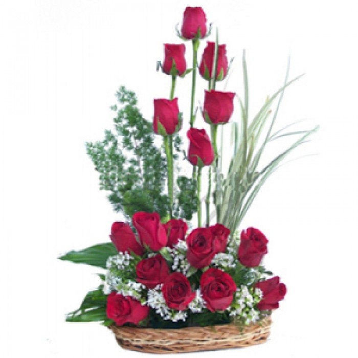 18 Red Roses arranged in a basket with lots of green foliage. The above image on the site is indicative in nature. Actual product may vary in shape or design as per the availability in various locations. Fresh flowers may be delivered in fully bloomed, semi-bloomed or bud stage. Occasionally, substitution of flowers is necessary due to temporary and/or regional unavailability issues.