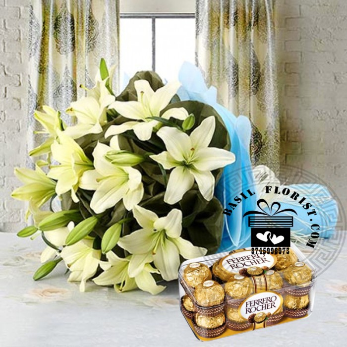 A beautiful bunch of white lily in a blue tissue wrapping. & a box of 16 ferrero rochere chocolates.
