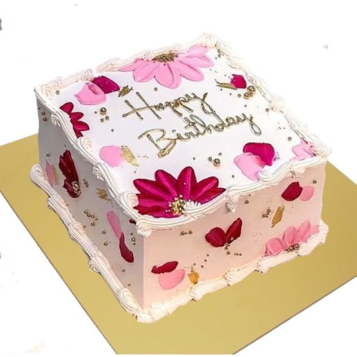 This elegant square birthday cake is a real showstopper. It features a smooth white base with hand-painted pink and deep red flowers, finished with gold accents for a touch of luxury. "Happy Birthday" is written in stylish gold cursive, and golden beads are scattered beautifully across the top.