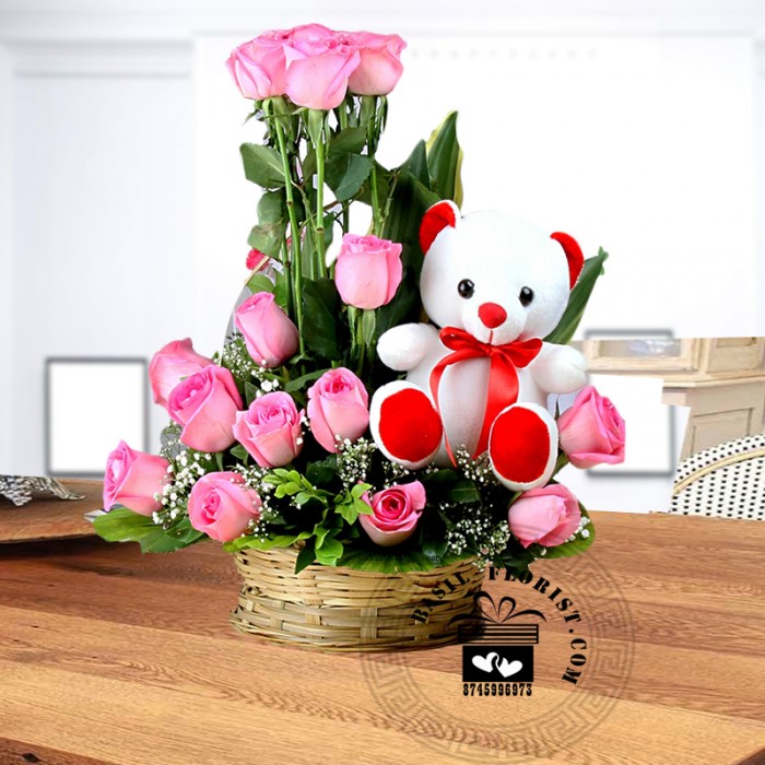 A beautiful arrangement of 15 hot pink roses with 6 inch teddy attached.