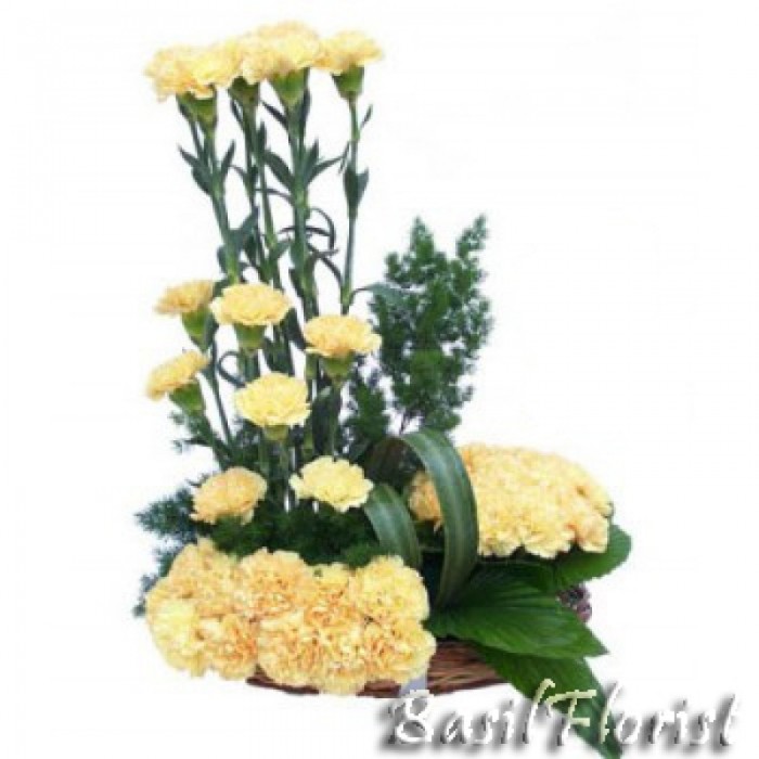 Beautiful Carnation Arrange in a cane basket combined with green foliage to give a elegant look.