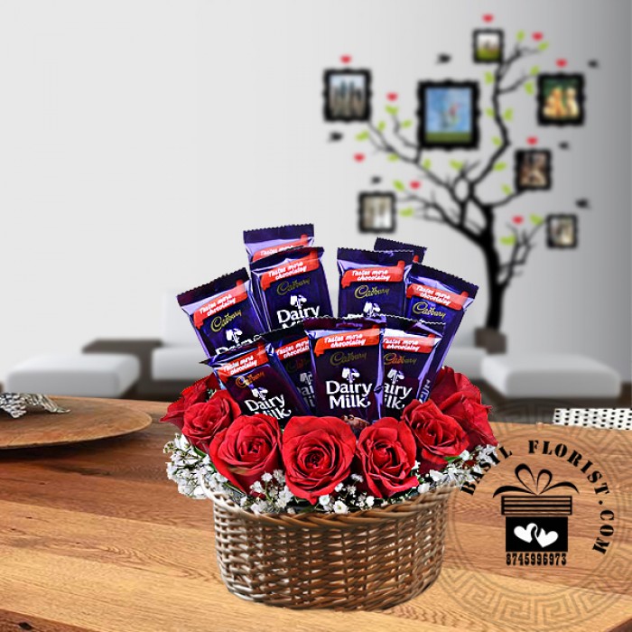 13 red roses arrangement & 10 cadbury dairy milk chocolate 52gm.
