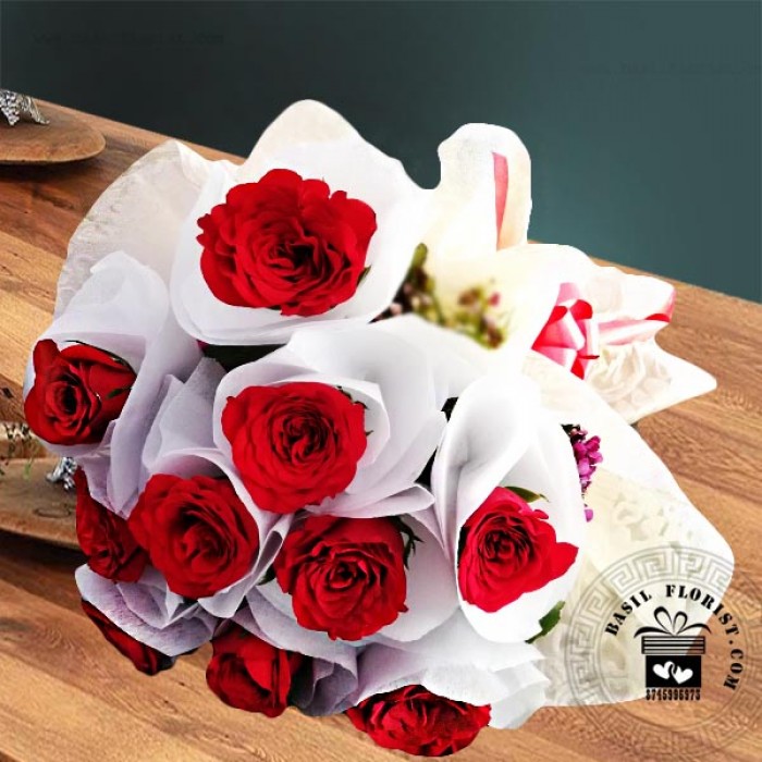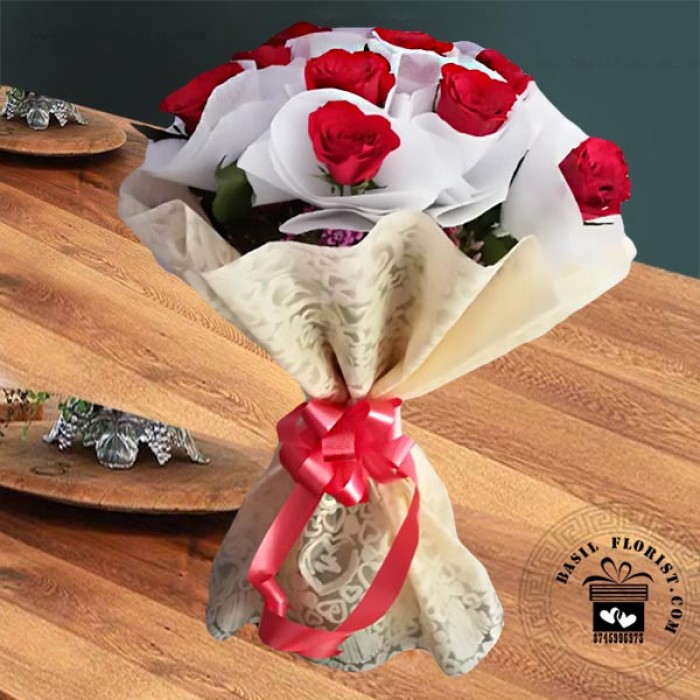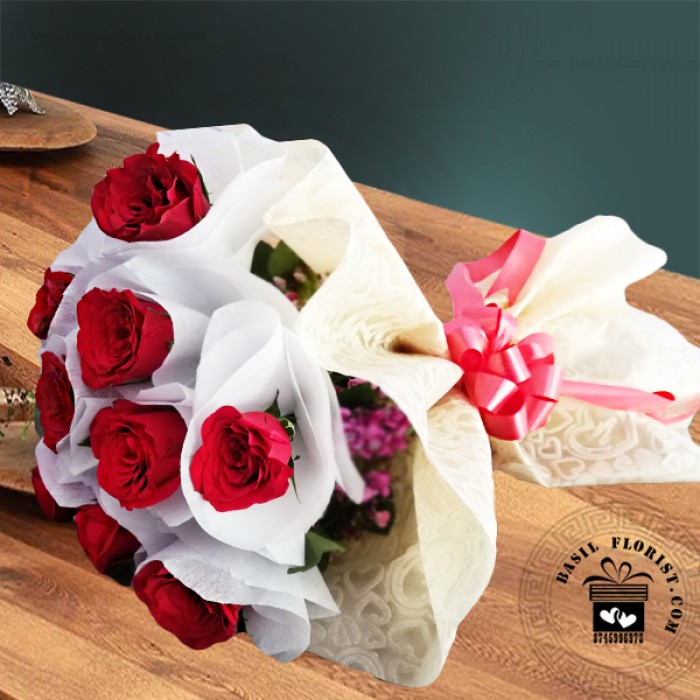 A beautiful bunch of ten red roses wrapped with imported tissue paper.